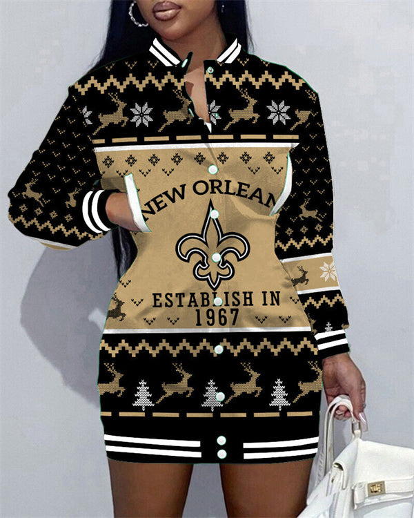 • Show off your New Orleans Saints pride in style with this fashionable Button Down Jacket Dress, designed for devoted fans who want to blend team spirit with everyday elegance.