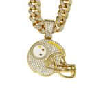 Show your team pride with this stunning Pittsburgh Steelers Bling Pendant Necklace. Featuring a fully iced-out football helmet pendant with the iconic Pittsburgh Steelers logo, this statement piece is crafted with premium materials for maximum shine and durability. Perfect for game days, parties, or everyday streetwear, this chain turns heads and shows your loyalty in style. Available in gold or silver finishes with a matching Cuban link chain.