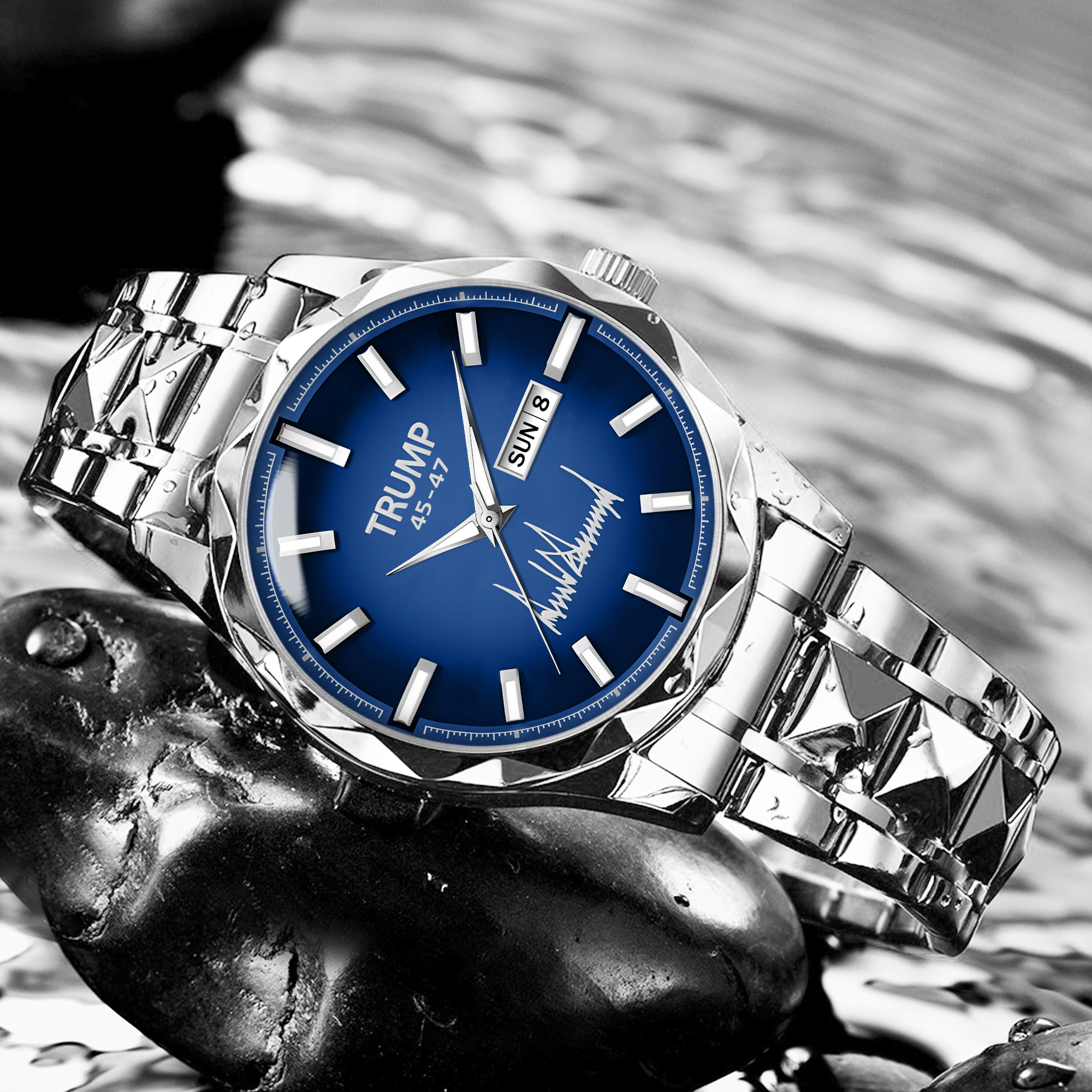 Experience the perfect blend of strength, elegance, and patriotic style with the TRUMP 45-47 Watch 2025 Signature – Liberty Edition. Designed for men who appreciate bold craftsmanship and presidential presence, this luxury timepiece features a stunning Liberty Steel Blue Dial paired with a polished silver steel case and bracelet.