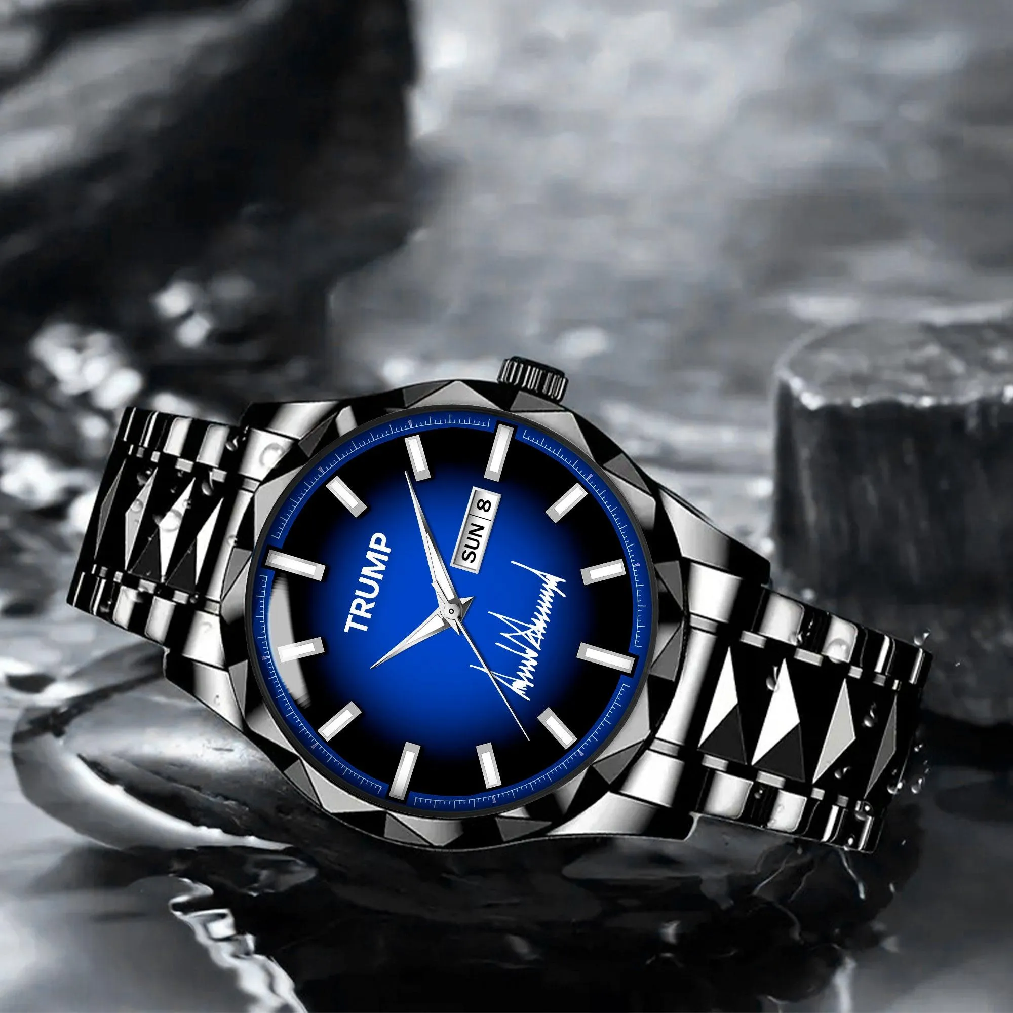 Bold, modern, and unmistakably elite, the TRUMP Watch 2025 (Luxury Black Steel Edition) brings together powerful aesthetics and refined design. Finished in deep jet-black stainless steel, this timepiece makes a striking impression, while the radiant Royal Blue Dial adds luxury, depth, and a commanding presence on the wrist.