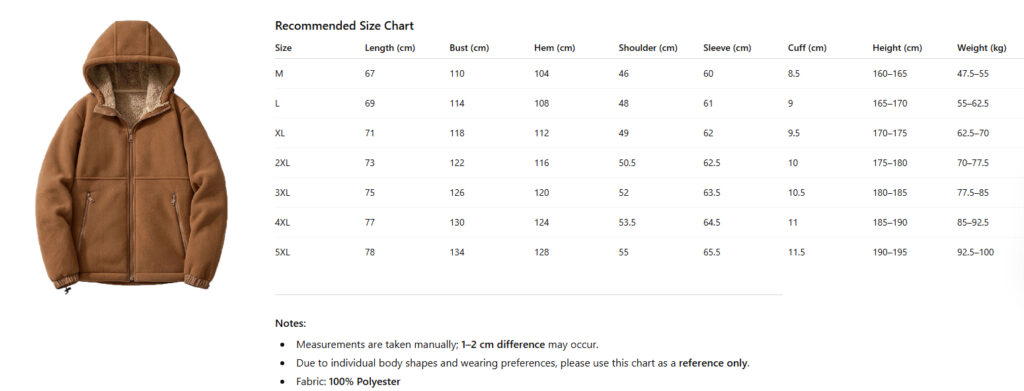 - Measurements may vary by 1–3 cm due to manual sizing.